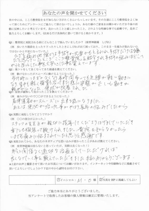 >ひざを痛め、他院では手術が必要かもと言われ手術だけは嫌だと思っていたところ「こころ整骨院」を紹介され手術の悩みはどこへやらと、ほっとした事をまた、安心した事を覚えています。
